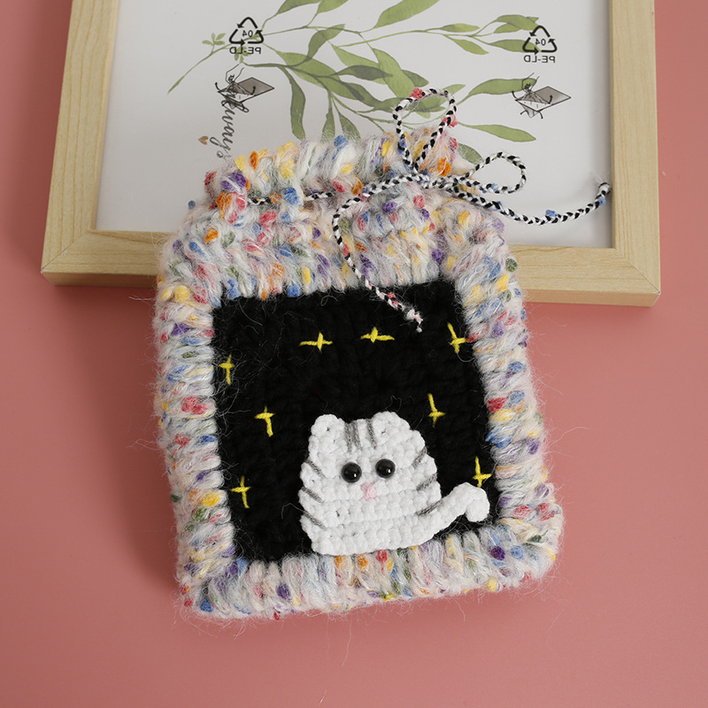 創意手編みの猫の小包の手混糸のかぎ針編みの斜め掛けの携帯電話のカバンのかわいい漫画の小銭入れの完成品
