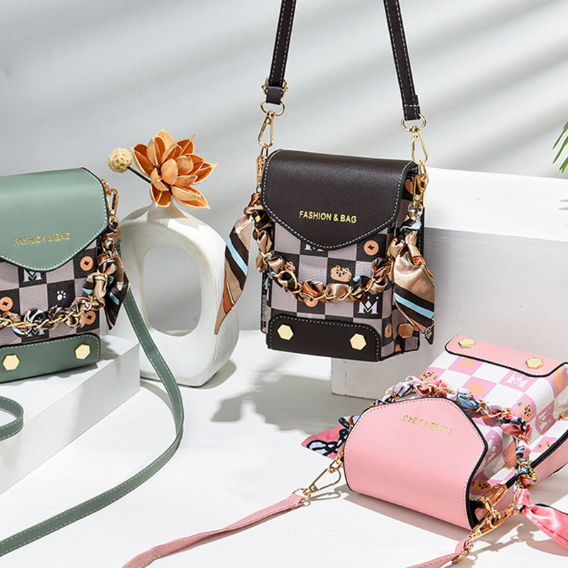 チェック柄プリントシルクスカーフ携帯電話バッグチェーンショルダーインターネット有名人クロスボディバッグ縦型小さな正方形バッグハイエンドミニ携帯電話バッグ