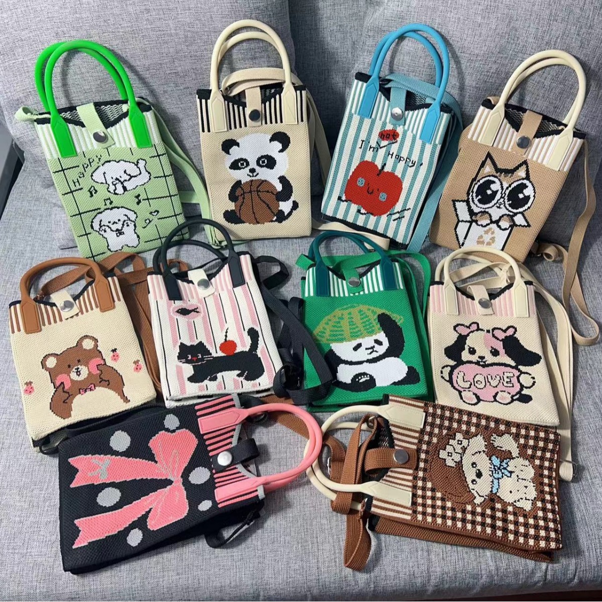 新作ニッチなレッサーパンダ柄スマホバッグ、ニットショルダーバッグ、クロスボディバッグ、ハンドバッグ、フリップバッグ、カジュアルバッグ、マカロンカラー