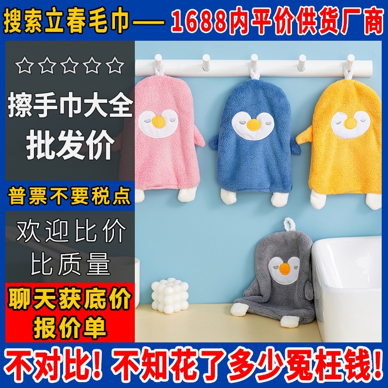 国境を越えた供給源のかわいい漫画風コーラルベルベットハンドタオル、バスルーム用雑巾、ペンギン型吊り下げ式子供用タオル、顔拭きタオル