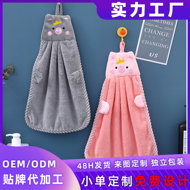 厚みのある家庭用バスルームキッチンピギーハンドタオル刺繍ロゴかわいい漫画コーラルベルベット吸収性柔らかい雑巾