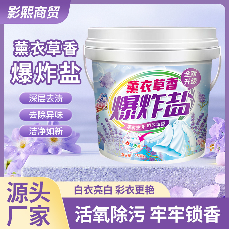 ラベンダー爆発塩は、黄ばみを取り除き、色付きの衣類を白くし、汚れやカビを除去します。