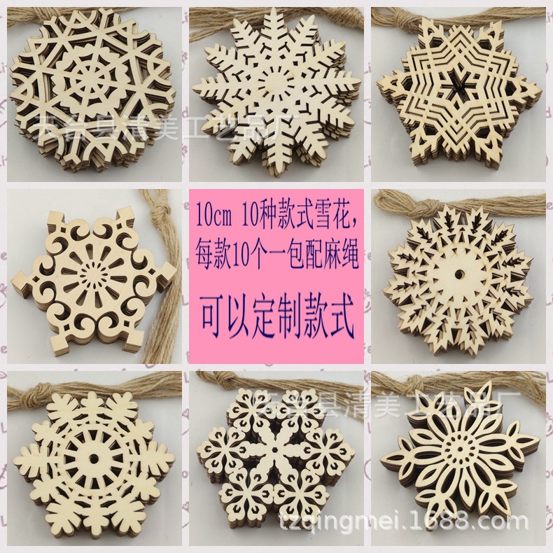 100mm10種類のデザインクリスマス雪花木片と麻縄飾り木製雪花ストラップ10個1包