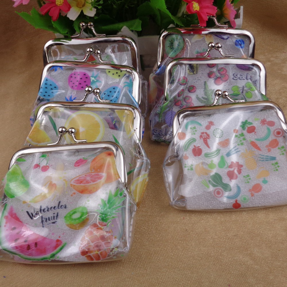 Pvc透明フルーツプリント図3インチクリップ小銭入れ、ppc素材コインバッグいちごパイナップルスイカ