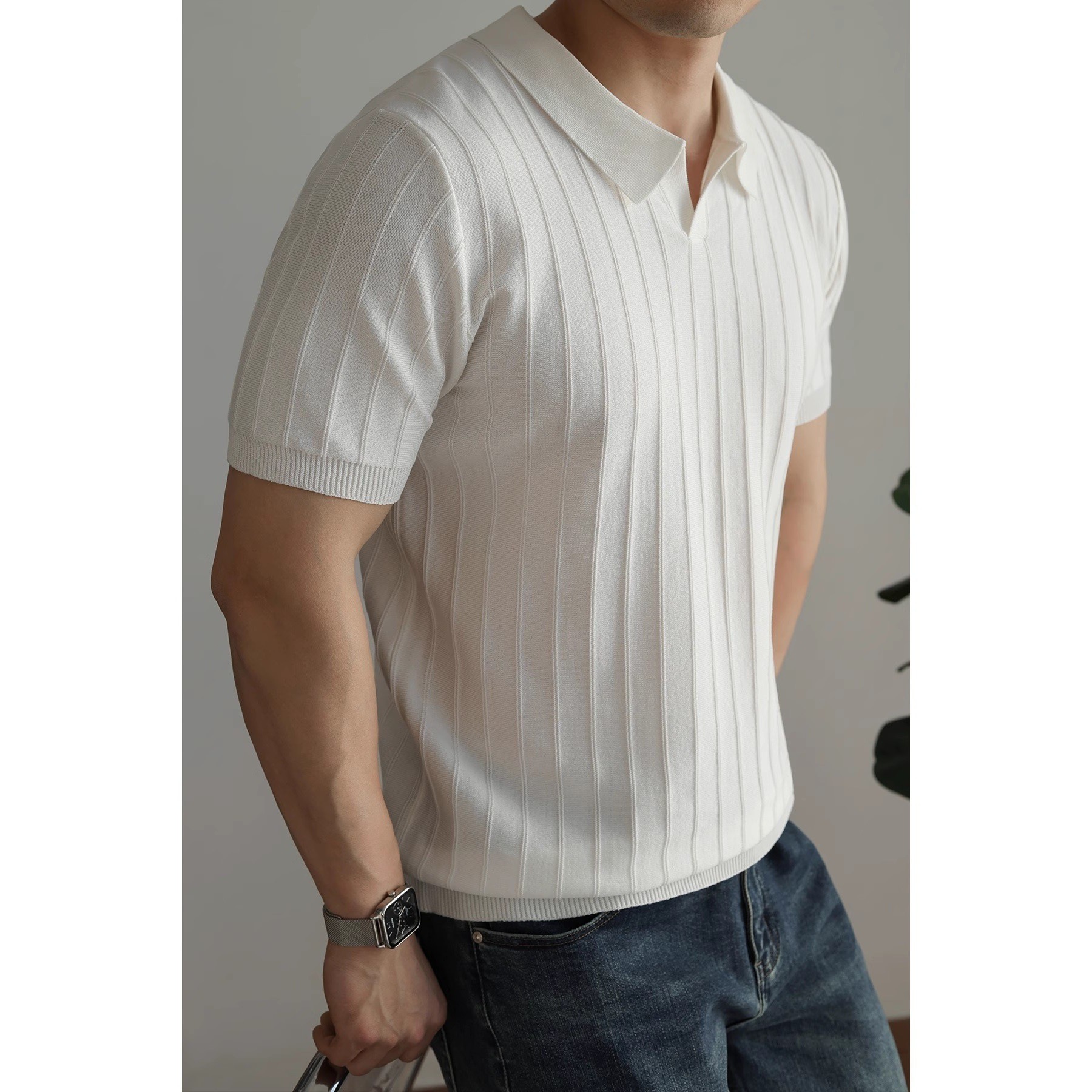 2025 夏イタリアニット縦ストライプ通気性ポロシャツビジネスカジュアルラペル半袖紳士ポロシャツ
