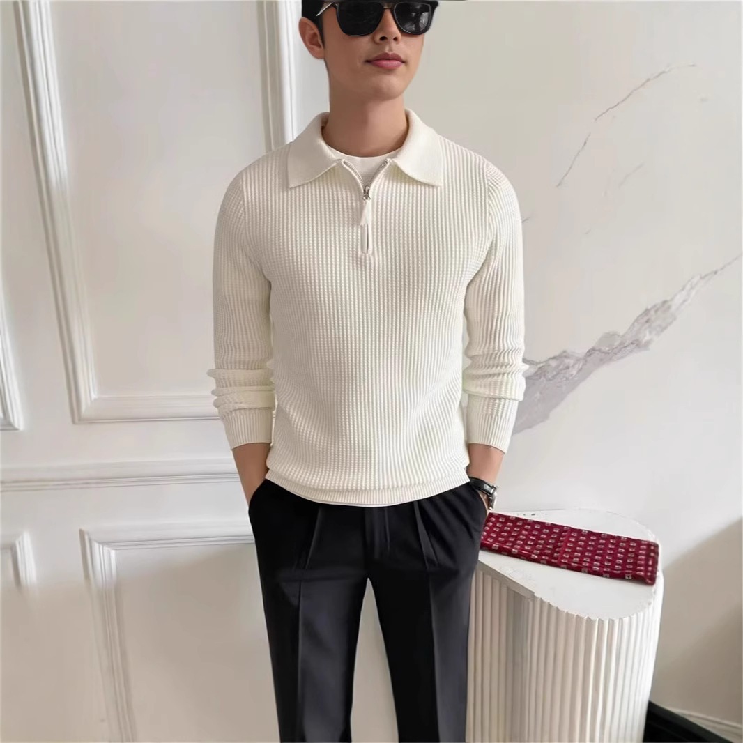 英国メンズ長袖ハーフジップポロラペルセータープルオーバーワッフル生地スリムソリッドカラーウールトップ