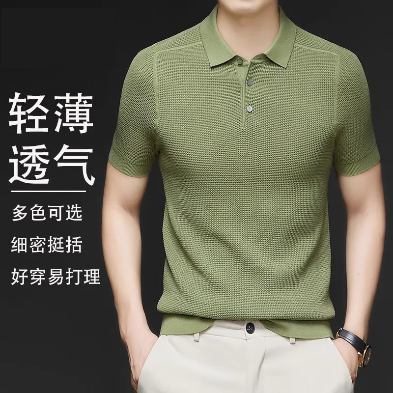 ハイエンドの軽い高級ニット半袖ポロシャツトップメンズ夏の新しい無地アイスシルクラペル半袖Tシャツ男性用