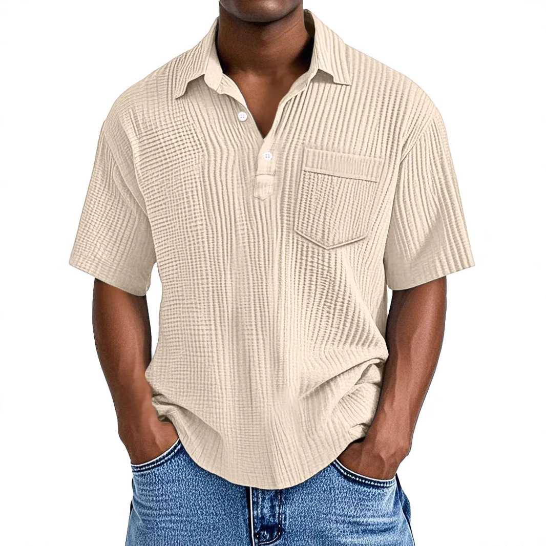 2024クロスボーダー新型欧米メンズカジュアルポロシャツ長袖ストライプボタンワッフルプリント長袖