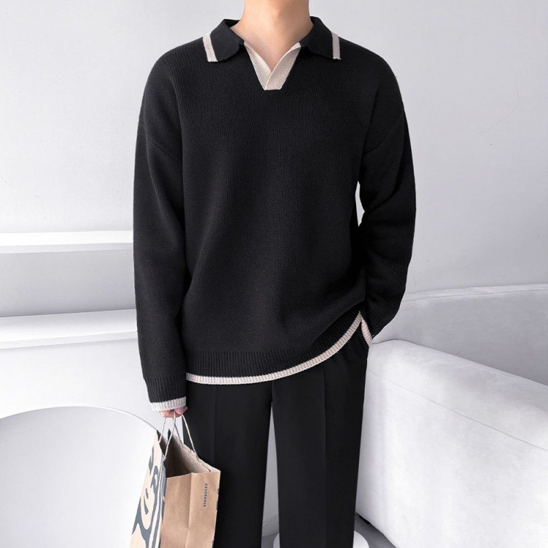 【クリアランス】コントラストカラーセーターメンズ春秋新作韓国風トレンドラペルセーターカジュアル長袖ポロシャツ