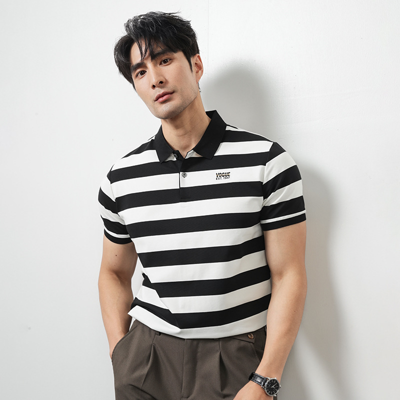夏の新型男性半袖tシャツストライプ綿100% 薄いビジネス襟メンズポロシャツ男性モデル