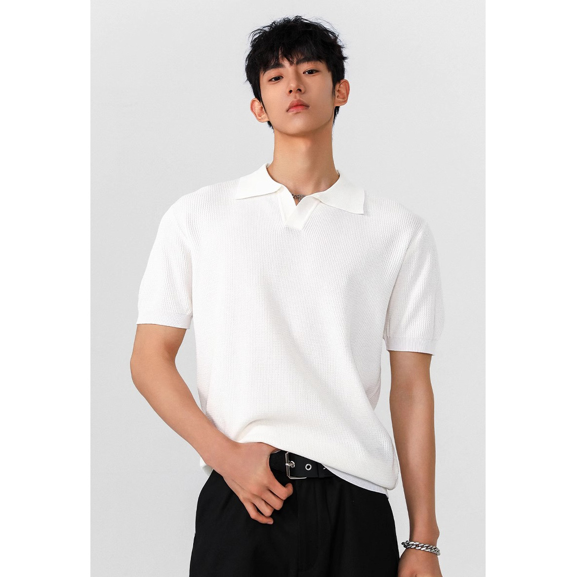 透かし彫りの網の目の木目のセイコーのニットの半袖のpoloシャツのtシャツの男性の夏の韓系の軽い熟の風の上着の体のシャツ