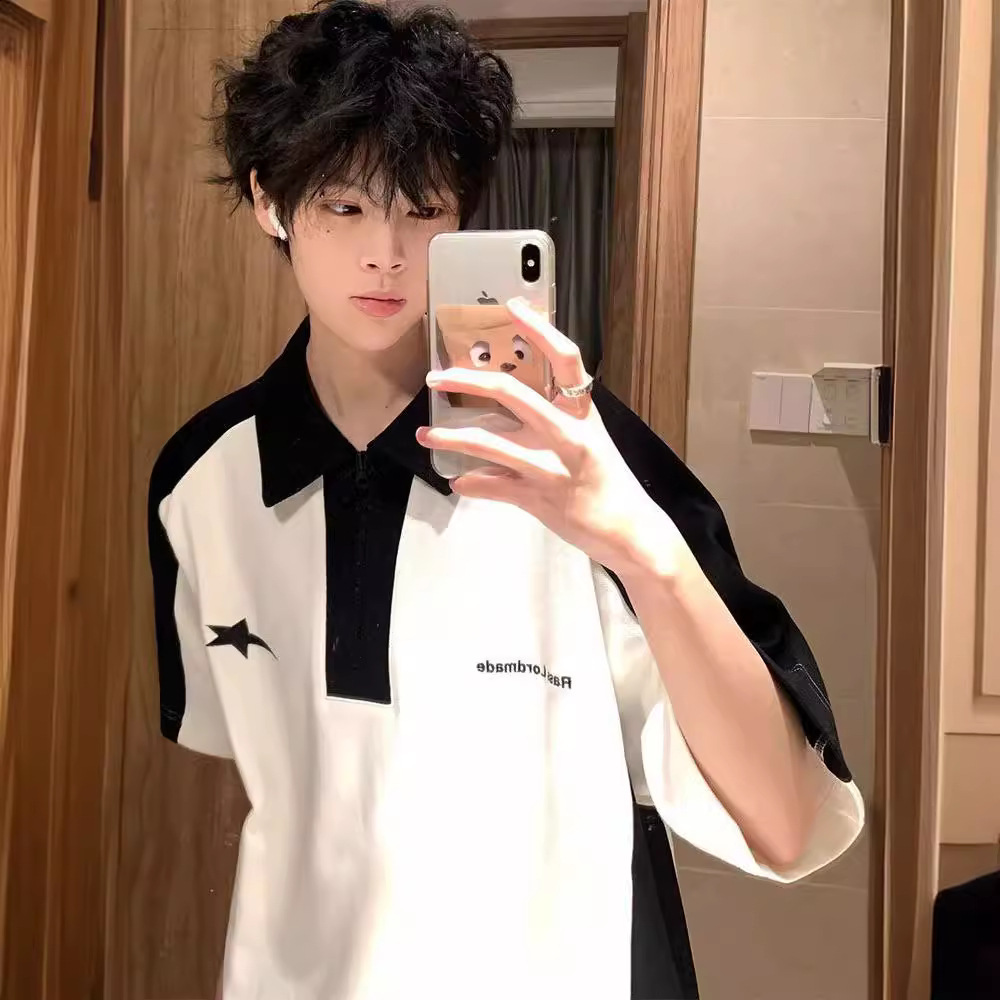 アメリカンキャンパスステッチpoloシャツハーフジッパープラス肩半袖学生青少年高校男子tシャツpro夏