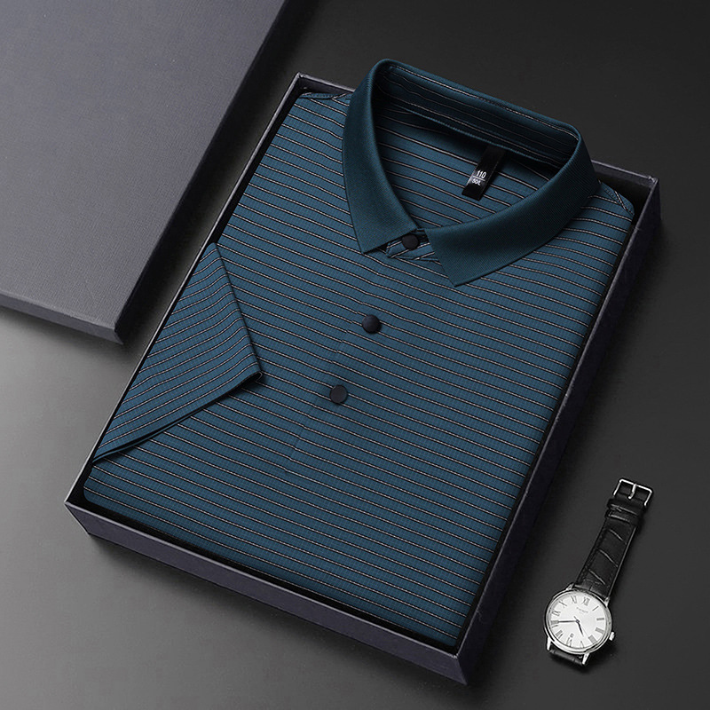 氷糸無痕poloシャツ半袖メンズ夏新作中年お父さん服ストライプ折り襟半袖tシャツトップス