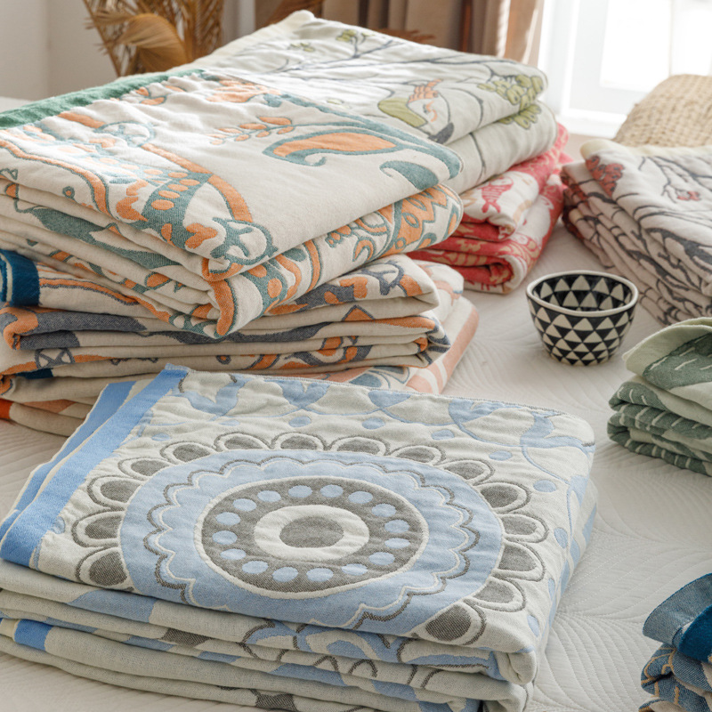 新しい外国貿易四層純綿ガーゼジャカードソファタオルエアコンブランケットは、外出用のカジュアルブランケットとしてタオルやキルトを敷いてカバーすることができます