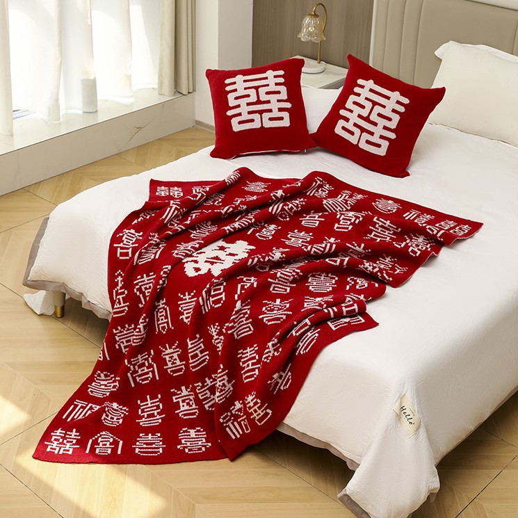 中国風高級結婚百喜蓋絨毯赤色の厚手の結婚部屋の装飾寝室のベッドの後ろにタオルを掛けます。