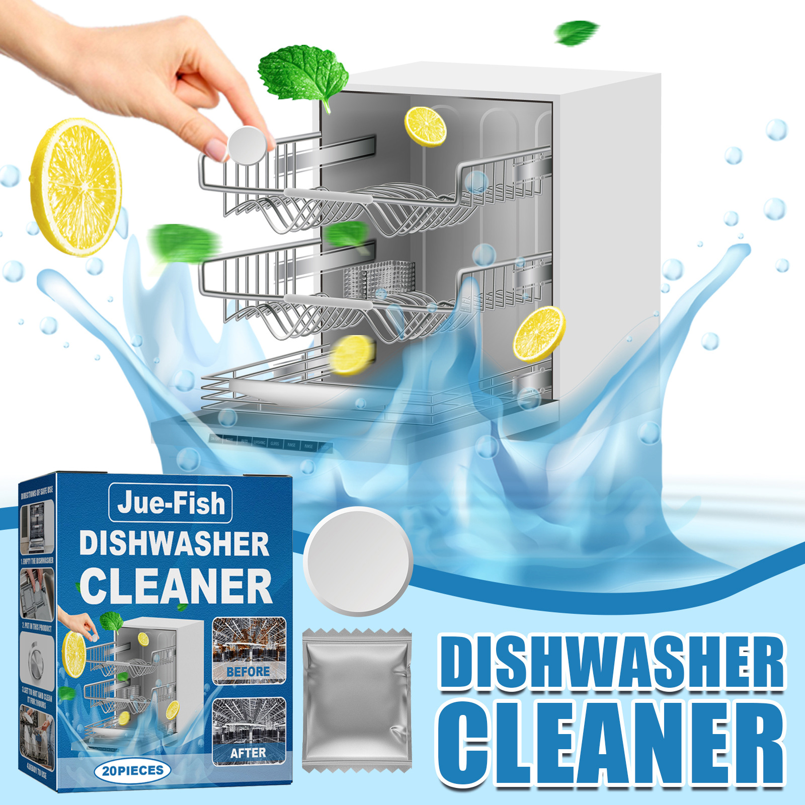 Jue-Fish 食器洗い機用洗浄タブレット、除染、油汚れ、スケール洗浄タブレット、食器洗い機専用メンテナンスタブレット