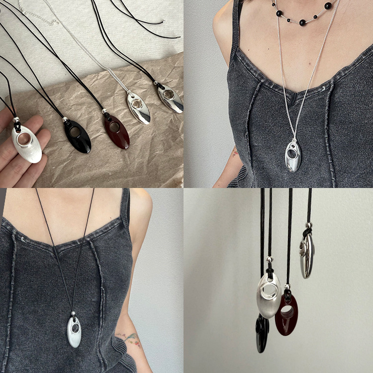 韓国ins博主は同じワインレッドのロングネックレス黒銀色U字楕円小衆デザイン感ネックレス女