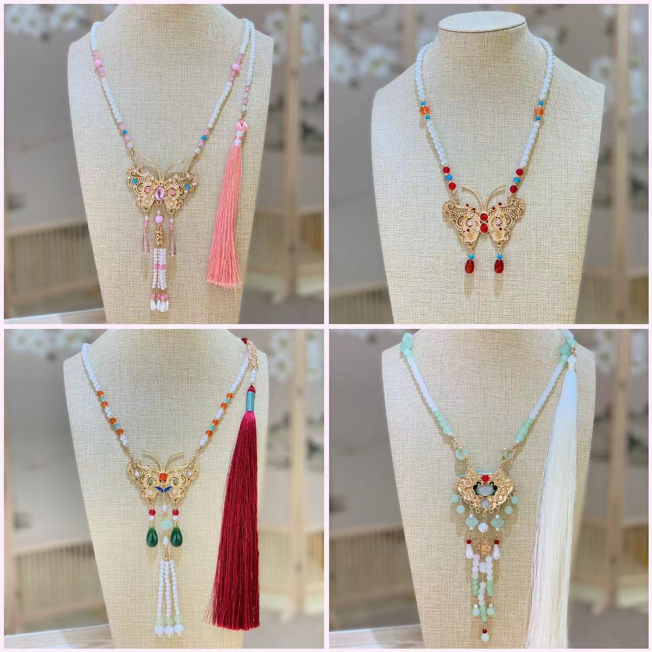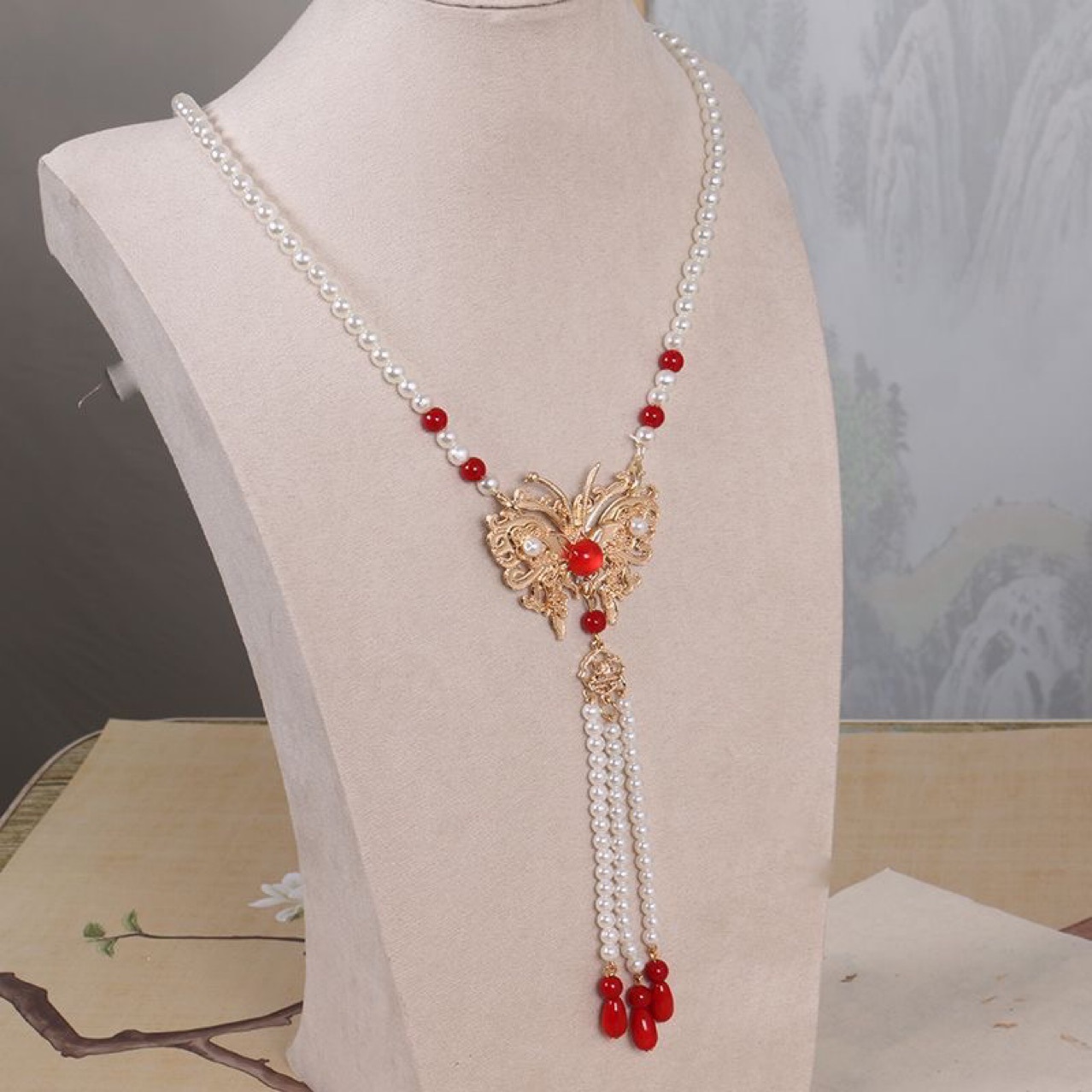 新しい中国風のピンクの蝶のロックの古風のフリンジネックレスのレトロな真珠のペンダントの馬のスカートの漢服の装飾