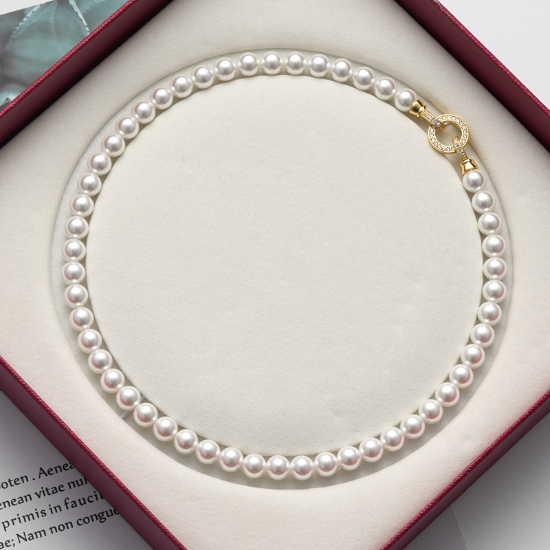 濃い灰色の貝殻は真珠の鎖の女性のジルコンの鎖をまねて白い貝の玉のネックレスの女性を掛けて彼女のお母さんの誕生日のプレゼントを送ります。