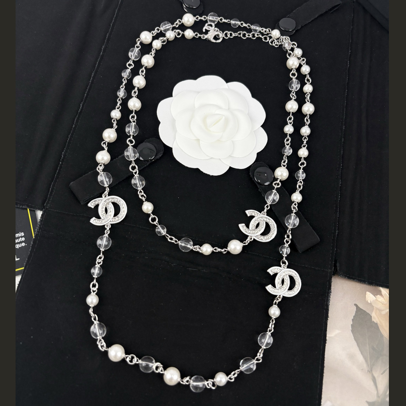 25C ハイバージョン C ホームリトルフレグランスホワイトエナメル透明パールハイエンドロングネックレス高品質セーターチェーン