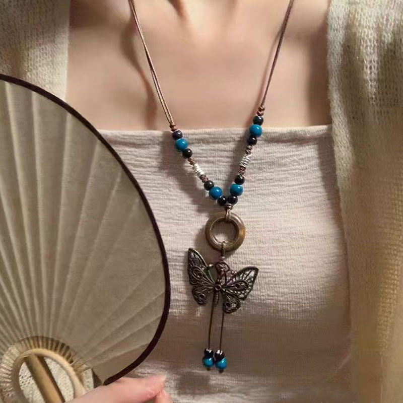 新しい中国風の蝶タッセルペンダントネックレス女性のレトロエスニックスタイルセーターチェーン古代スタイルニッチ多用途鎖骨チェーントレンド