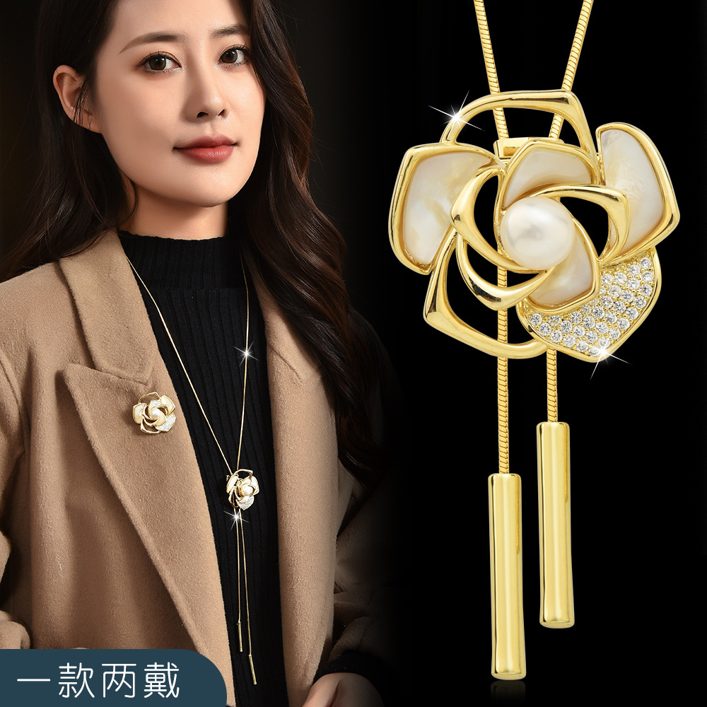 メーカー直販秋冬新作貝殻バラのロングタイプのネックレスを二つつけています。