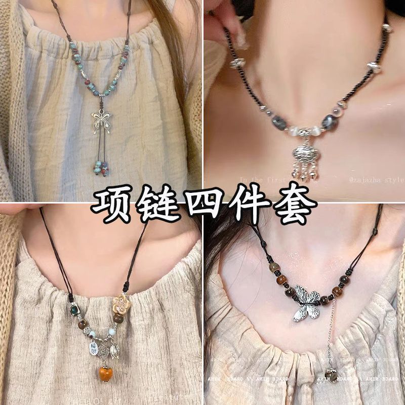 カラフルなビーズ蝶編組ロープネックレス新しい中国風エスニック古代スタイルアクセサリーライト高級ハイエンド鎖骨チェーン