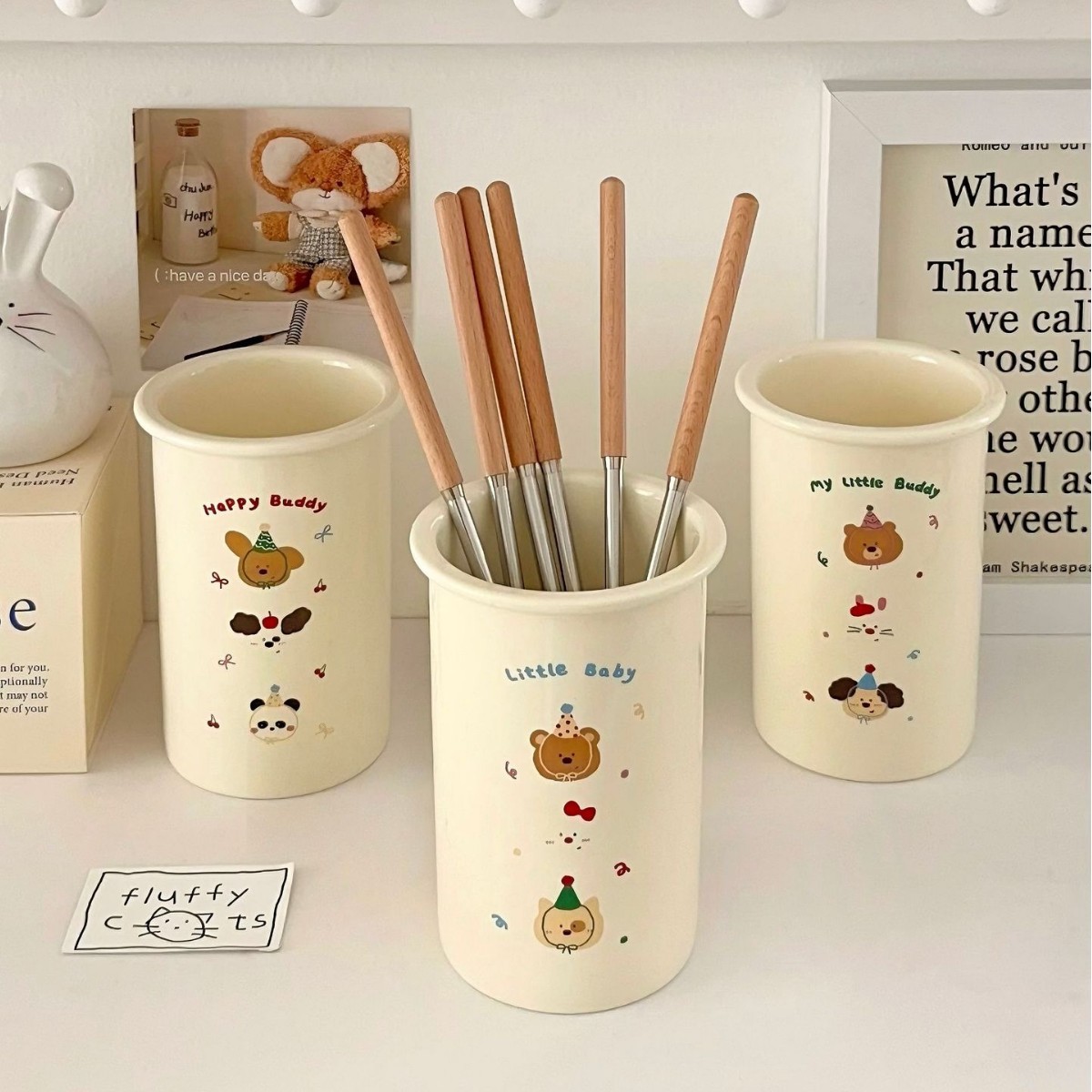 創意的なアニメの熊の陶磁器の箸立ての軽い贅沢な家庭用の水切り棚の箸籠のナイフとスプーンの食器の収納箱