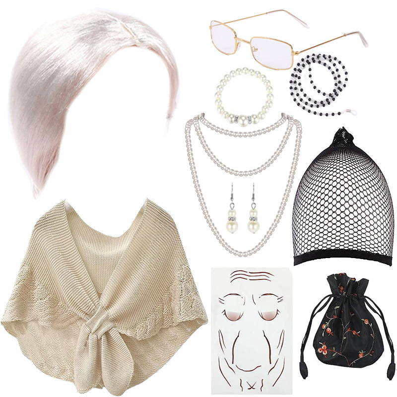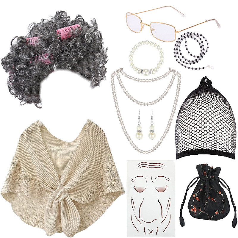 アマゾンの人気のあるおばあさんのかつらハロウィーン舞踏会の演技はcosおばあさんの手提げ袋のセットを飾っている