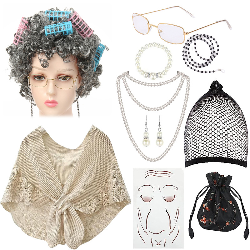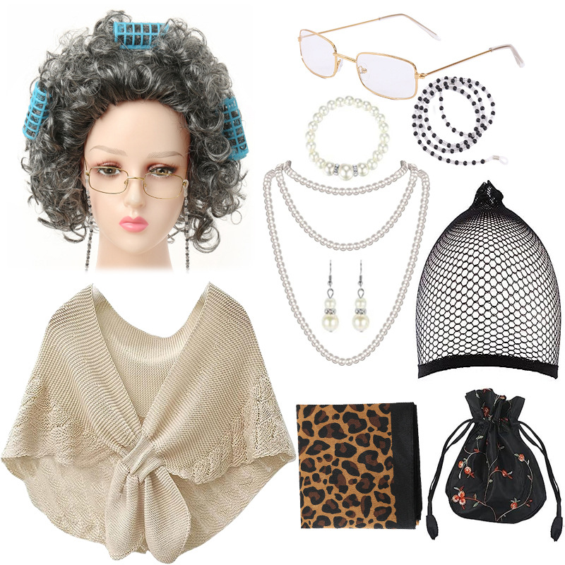 アマゾンのよく売れているおばあさんのかつらのハロウィンの舞踏会のショーは男女の通用する手提げ袋のスーツを飾ります。