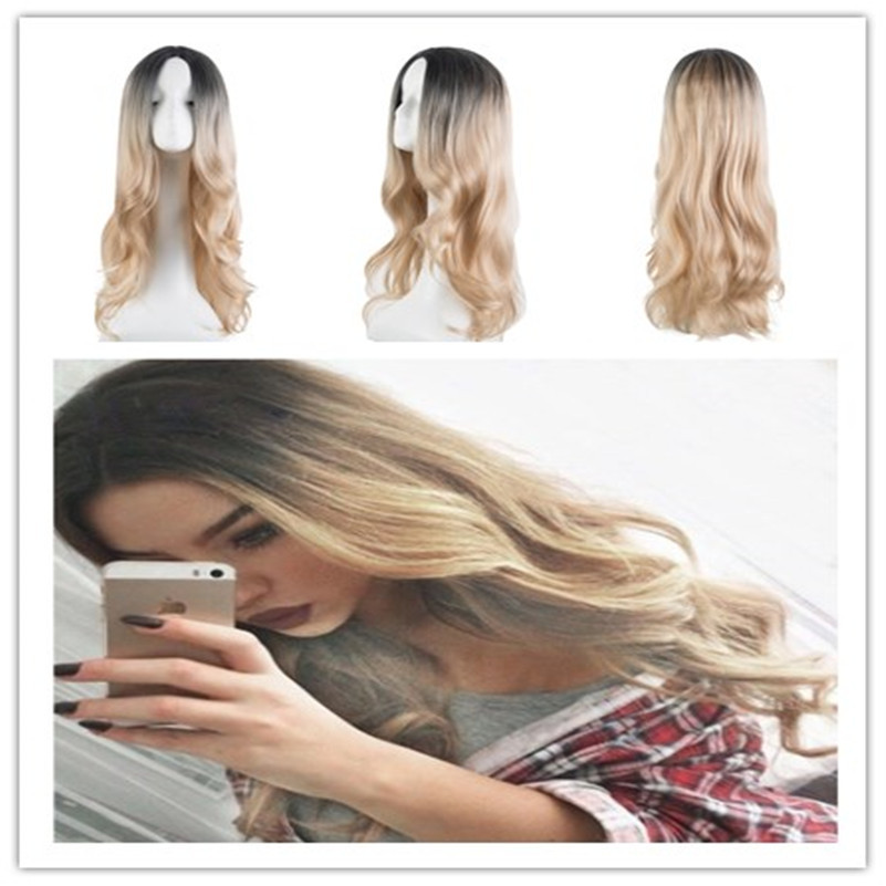 コスプレかつらグラデーションカラー金色中分巻髪cosアニメかつら染色波髪wigs