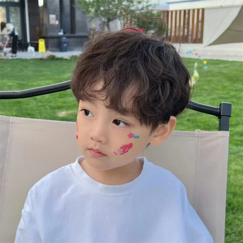 子供のかつらの男性の錫の紙は短い巻き髪の赤ちゃんの写真を撮ってふわふわしています。