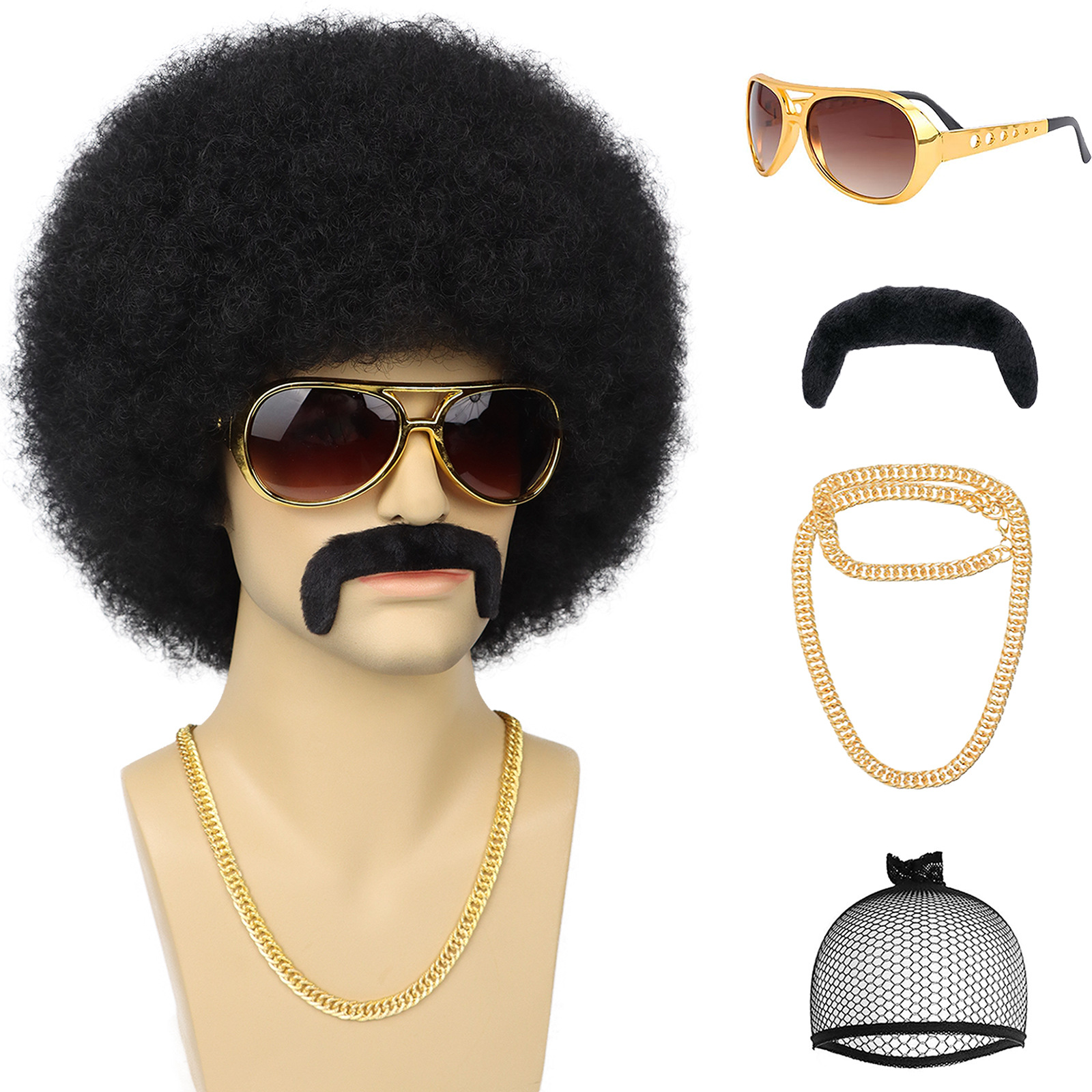 50sメンズロック髪ハロウィンディスコヒッピー80sパンクdiscoネックレスブラックファンかつら