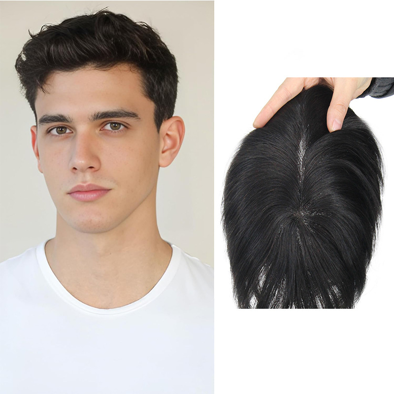 メンズ用本物の髪の毛のヘアピース、地中海型トップヘアピース、機械製かつら、接着剤で取り付け可能、在庫あり、通気性のある髪質
