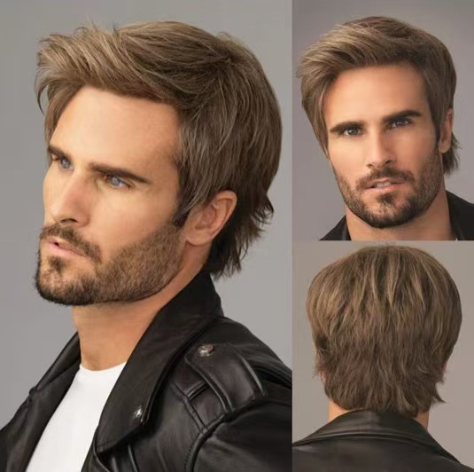 かつら男性短髪男性の本物のかつらカバーが薄くて通気性が短いストレートな髪の質感が整っています。