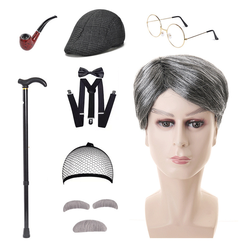 アマゾンおじいさんかつらグレー中高年男性ショートヘアカバー老婆花白髪ステージショースーツ