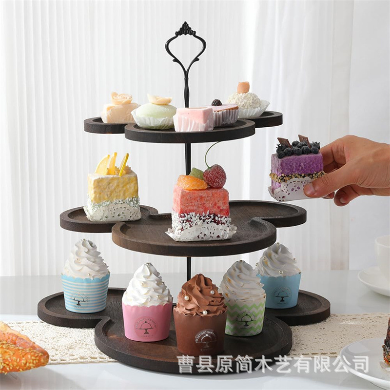 木製の棚ケーキ棚の下のお茶のテーブルの層式のトレーのデザートの紙コップのケーキの塔の実木の展示棚