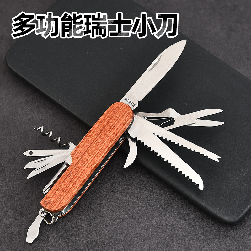 スポット直販多機能スイスアウトドア多目的木製ハンドルナイフキャンプポータブル小型折りたたみナイフ