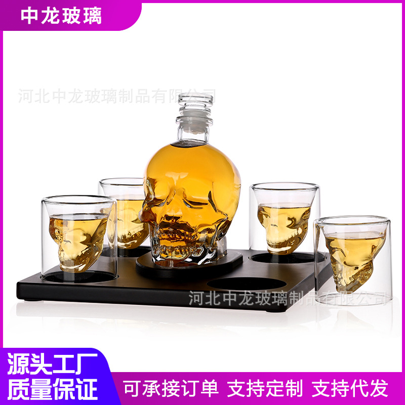 スカルタイプのデキャンタとスカル付きのカップセットには、木のトレーが含まれています。