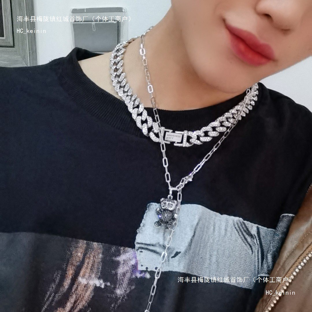 Shijia 1:1 ペアバージョンブラックシャイニーテディベアネックレスメンズスワロフスキーハートビア鎖骨チェーンレディースドロップシッピング