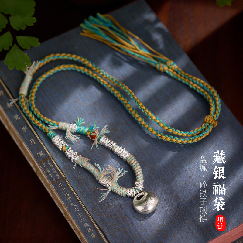 チベット手巻き綿糸マネーバッグネックレス女性用、銀の細断手織りエスニックスタイルペンダントセーターチェーン卸売