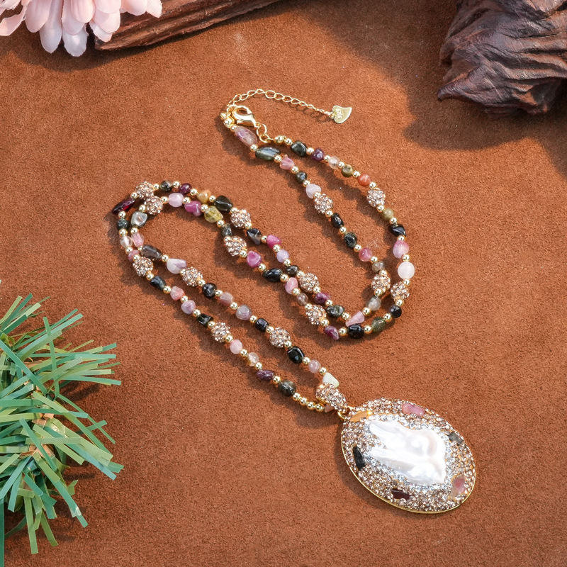 天然バロック淡水真珠ネックレスは天然虎石原石高級感碧璽スルタン石セーターチェーンをはめ込んでいます。