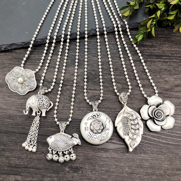 新中国式レトロな泰銀の長いネックレスの民族風福袋の花のペンダントのシンプルな長いタイプのセーターのチェーンは女性を飾ります。
