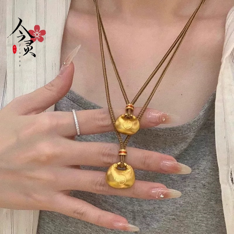 古法の金色のダイヤモンドのシルクの福袋のペンダントのネックレスの女性の中国式の軽くて豪華な高級感の花の糸のお金の袋の鎖の骨のチェーン