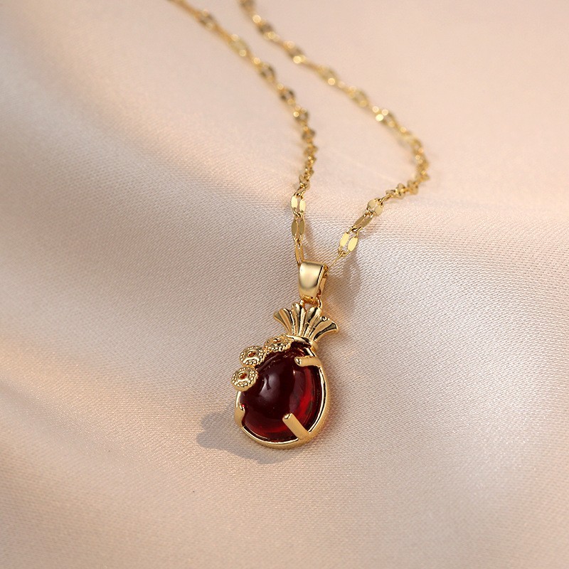 レトロなお金の袋のネックレスの女性の軽い豪華なガーネットの福袋のペンダントの気質の鎖のチェーンの誕生日の贈り物の軽い豪華な風のネックレス