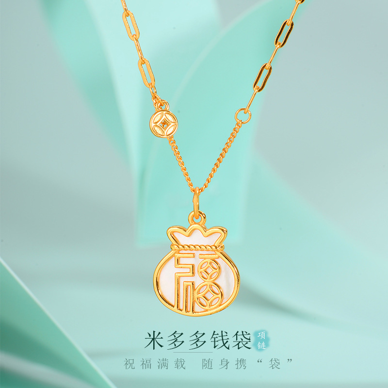 【チタン鋼の真金メッキ】霊動の立体透かし彫りの銭袋のミニネックレスの小さい福袋の鎖の鎖のアクセサリー