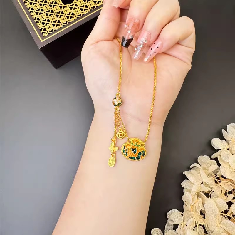 ゴールドストアと同じスタイルの古代サンドゴールドエナメル幸運のお金袋セットチェーン両面お金祝福蓮の花の祝福袋ネックレス女性用