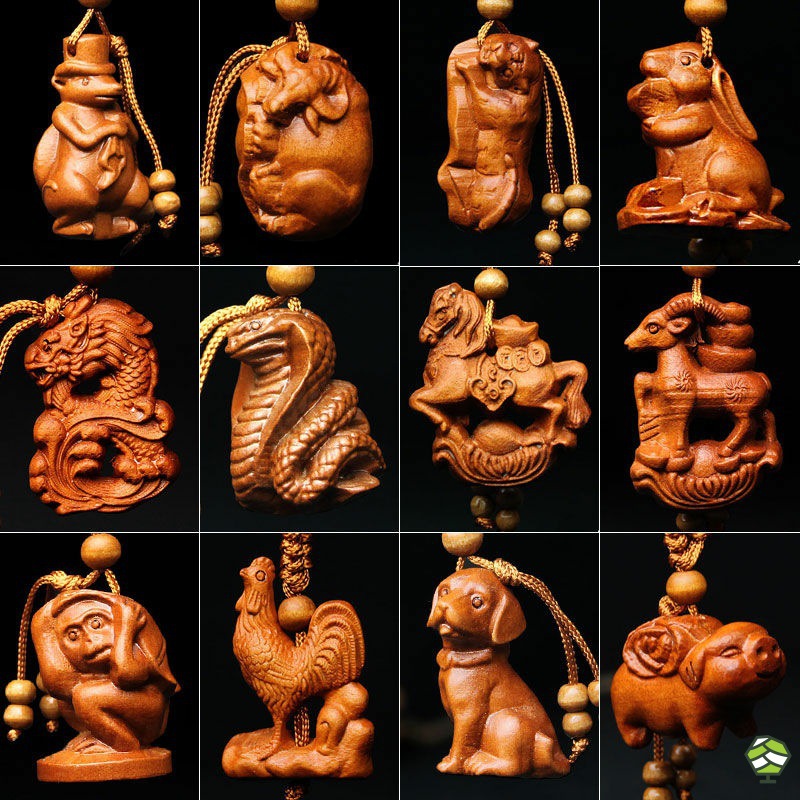木の彫刻の十二生肖のペンダントはネズミの牛の虎のウサギの竜の蛇の馬の羊のサルのニワトリの犬のブタの車の鍵の掛けの極凱です。