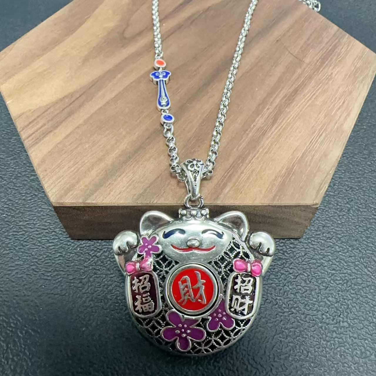 ファッションシンプル銭袋透かし彫り花糸エナメル招財猫ネックレス宮廷風ペンダント女性新国風百合アクセサリー