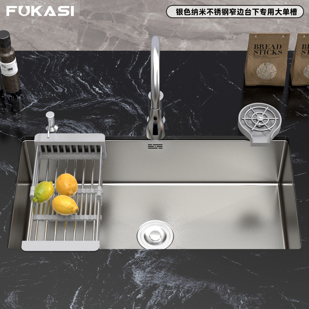 ステンレス厚手キッチンシンクナノシルバー角蓋台下盆大単槽洗杯器家庭用304洗菜盆
